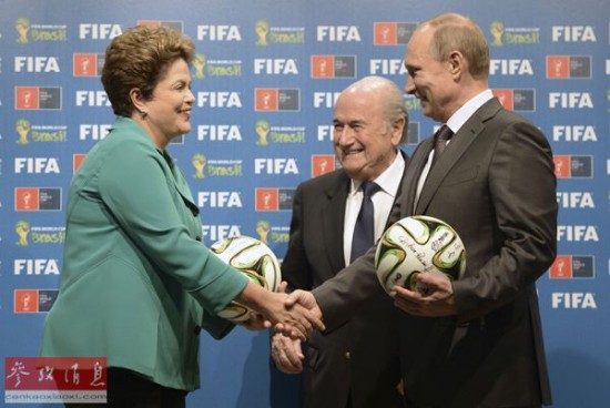 13日,巴西总统罗塞夫(左)、俄罗斯总统普京(右)和国际足联主席布拉特出席在里约热内卢举行的世界杯举办权交接仪式。(路透社)