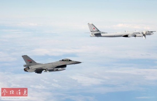 资料图片:挪威军方公布照片,该国空军F-16战机升空拦截飞越挪威海的俄罗斯图-95轰炸机。