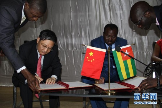 11月20日,在多哥首都洛美,中国驻多哥大使刘豫锡(左二)和多哥总理兼卫生部长奎西·塞莱亚戈吉·阿胡梅-祖努(右二)防控埃博拉物资交接仪式上签字。当日,中国政府向多哥捐赠一批医疗援助物资,以协助多哥防控埃博拉疫情。 新华社记者张改萍摄
