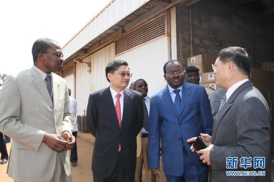 11月20日,在多哥首都洛美,中国驻多哥商务参赞胡平(右一)为多哥总理兼卫生部长阿胡梅-祖努(右二)介绍由中国政府捐赠的防控埃博拉物资。当日,中国政府向多哥捐赠一批医疗援助物资,以协助多哥防控埃博拉疫情。 新华社记者张改萍摄