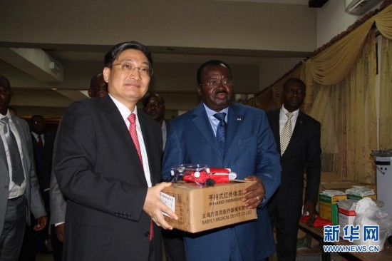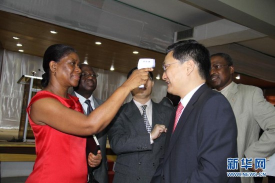11月20日,在多哥首都洛美,世界卫生组织驻多哥代表安布阿正(左)在试用体温检测设备。当日,中国政府向多哥捐赠一批医疗援助物资,以协助多哥防控埃博拉疫情。 新华社记者张改萍摄