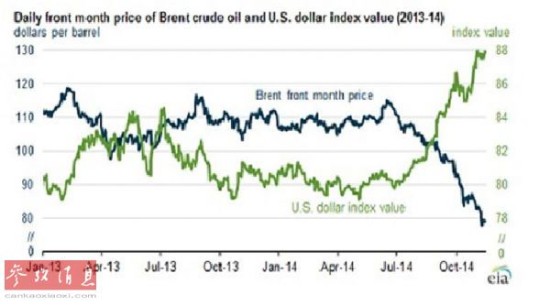 2013-2014年布伦特原油价格和美元指数走势图(英国《每日电讯报》网站)