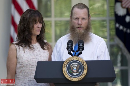 5月31日,美国总统奥巴马(中)与被阿富汗塔利班俘虏的唯一一名美军士兵鲍·伯格达尔的父亲鲍勃和母亲贾妮在华盛顿白宫出席新闻发布会后离开。美国总统奥巴马5月31日宣布,被阿富汗塔利班俘虏的唯一一名美军士兵鲍·伯格达尔已于当天获释。美国媒体称,这是美方用关押在美军关塔那摩监狱的5名塔利班囚徒交换的结果。伯格达尔于2009年6月30日在阿富汗失踪,后被证实落入塔利班之手。新华社/美联