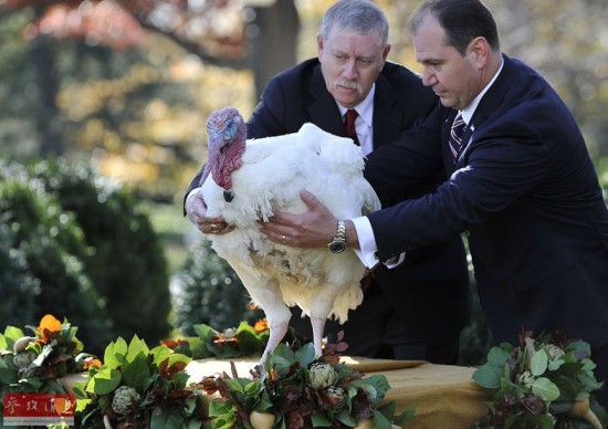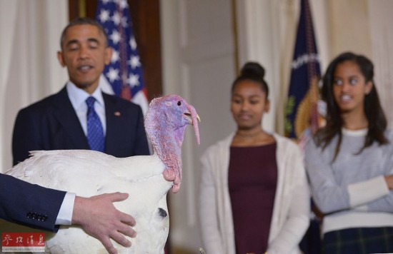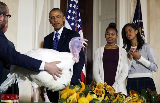 11月26日,在美国首都华盛顿白宫里,举行一年一度的感恩节火鸡赦免仪式,总统奥巴马带着他的两个女儿在仪式上赦免一只名叫“芝士”的火鸡。按照习俗,美国总统每年都会在感恩节前一天在白宫赦免火鸡,使其免于成为感恩节大餐。美国总统特赦火鸡的传统始于杜鲁门总统时代。