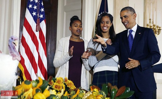 据美国之音电台11月27日报道,奥巴马总统的两个女儿——萨莎和玛丽亚26日也在白宫参加了赦免仪式。奥巴马赦免的火鸡名叫“芝士”,它是一只圆嘟嘟的有着玫瑰红脑袋和脖子的白色火鸡。这只火鸡是在一年一度的感恩节假日前夕获赦免。