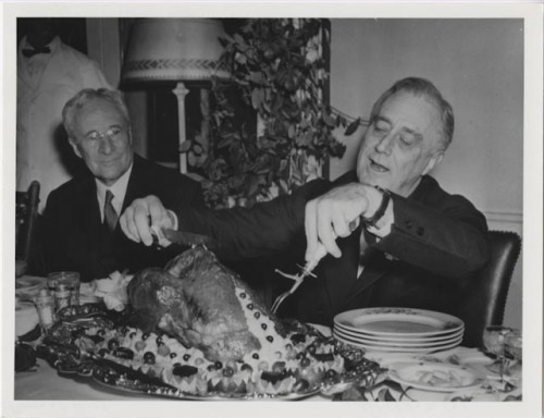 富兰克林·罗斯福是第一位在海外度过感恩节的总统。1943年二战期间,当年的11月25日感恩节,罗斯福与英国首相丘吉尔等人在开罗一同度过。罗斯福还在日记中说,他从家里带来了2只火鸡,最后与丘吉尔一同享用。