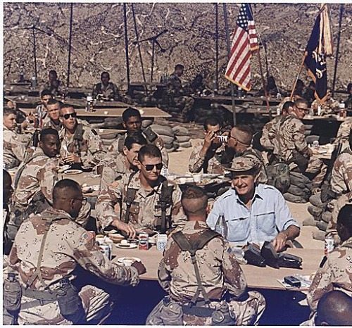 1990年,老布什在感恩节当天探访驻在沙特的美国大兵。