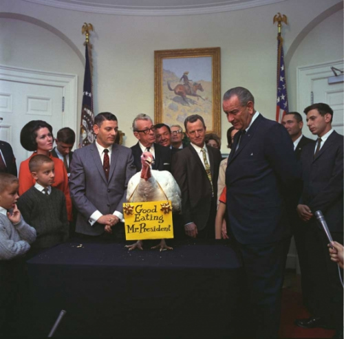1967年,林顿·约翰逊总统收到的火鸡身上挂着牌子,上面写着“吃好喝好,总统先生”。