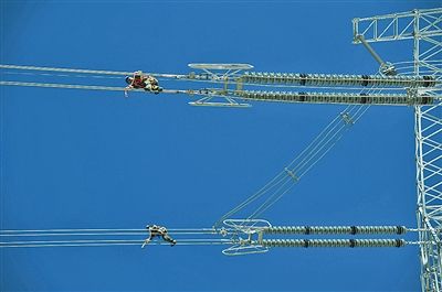 下图:官兵们正在空中走线。 王志明 摄