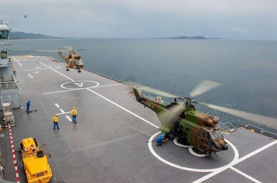 直升机准备着舰。