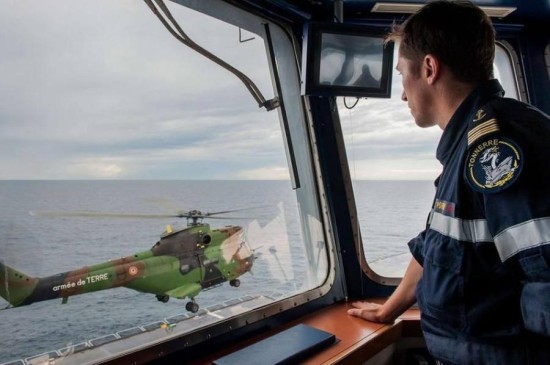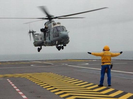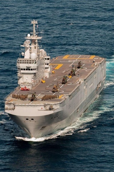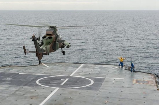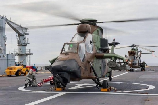 法军虎式武装直升机准备从攻击舰上起飞。