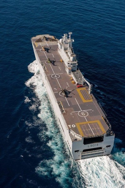 从航母甲板上看两栖舰。
