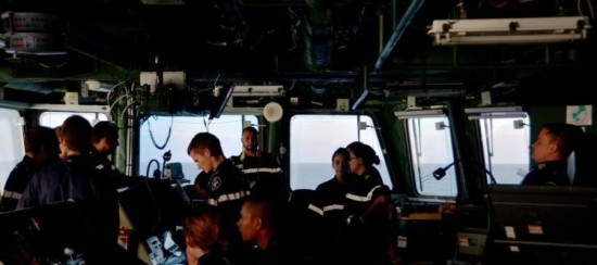 从舰桥内部观看对面的戴高乐号核动力航母。