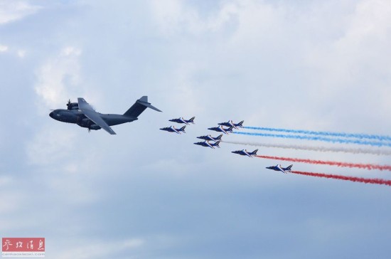 资料图片:空客A400M运输机率法兰西“巡逻兵”飞行表演队进行飞行表演。