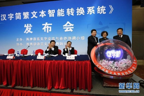 11月18日,教育部副部长、国家语委主任李卫红(右二),中共中央台办、国务院台办主任助理龙明彪(右三)和两岸语言文字交流与合作协调小组组长李宇明(右一)共同启动《汉字简繁文本智能转换系统》。当日,《汉字简繁文本智能转换系统》在北京正式发布,并将免费供社会使用。该系统能够进行面向中国台湾和面向古籍的两种简繁转换,克服了同类软件在“一简对多繁”转换情况下的不足;可同时进行字、词、专业术语、标点符号等多种转换,还提供了网站全部网页转换功能。经中国中文信息学会评测,该系统在字级别简体到繁体的转换准确率达到99.99%。相关专家认为,该系统转换准确率高、功能丰富、性能稳定,研究成果处于国际领先水平。 2009年7月,在湖南长沙举行的第五届两岸经贸文化论坛上达成了关于两岸合作研发汉字文本简繁转换系统的共同建议。为落实论坛建议,教育部、国家语委于2012年底启动《汉字简繁文本智能转换系统》项目研发,由厦门大学、教育部语言文字应用研究所、北京师范大学联合承担。系统于2014年7月通过专家鉴定。新华社记者 沈伯韩 摄