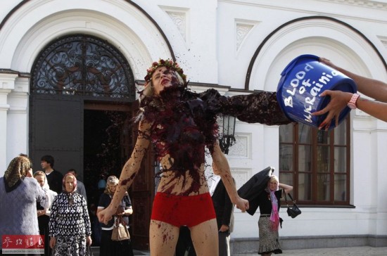 资料图片:乌克兰女权运动组织Femen成员举行示威,声称抗议俄罗斯“入侵”乌克兰。