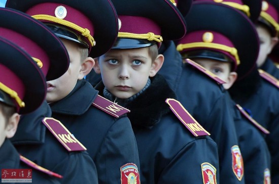 资料图片:穿军装的少年儿童参加乌克兰解放70周年纪念仪式。新华社法新