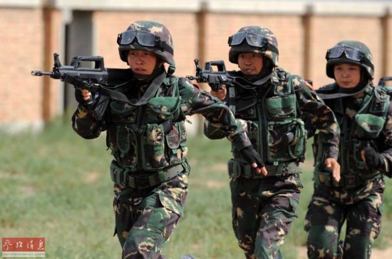 女子特战队员在“和平使命—2014”联合反恐军事演习的前期分组训练中进行实装实兵训练(8月20日摄)。新华社记者张领摄