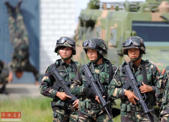 女子特战队员在“和平使命—2014”联合反恐军事演习的前期分组训练中整装待发(8月20日摄)。新华社记者张领摄