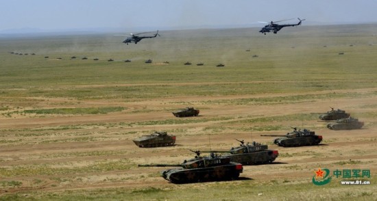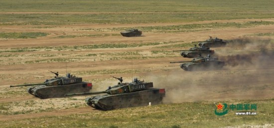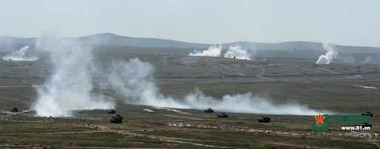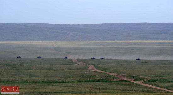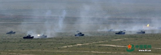 在内蒙古朱日和训练基地,参加“和平使命—2014”联合反恐军事演习的陆军战斗群坦克在战役协同训练中(8月20日摄)。新华社记者 张领 摄?