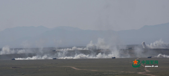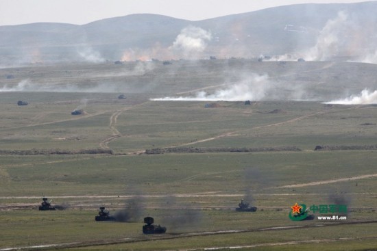 8月29日上午10时37分,中方、俄方前沿攻击队步战车正在展开。图为俄方攻击队对敌前沿装甲目标实施打击。