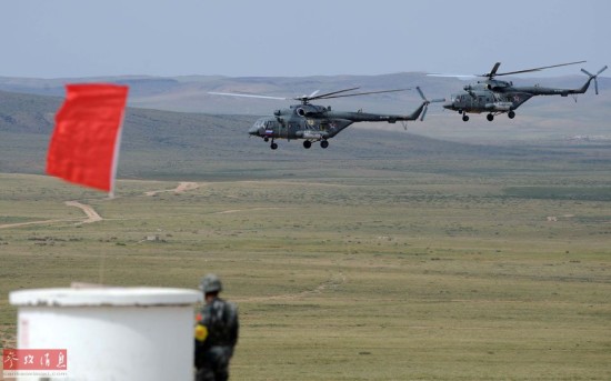 在内蒙古朱日和训练基地,参加“和平使命—2014”联合反恐军事演习的空军战斗群“米—8”直升机在战役协同训练中(8月20日摄)。新华社记者 张领 摄