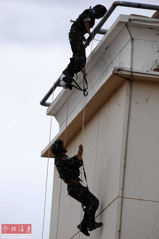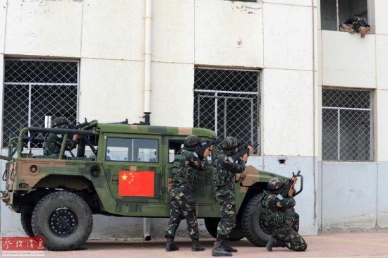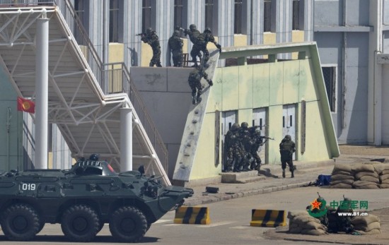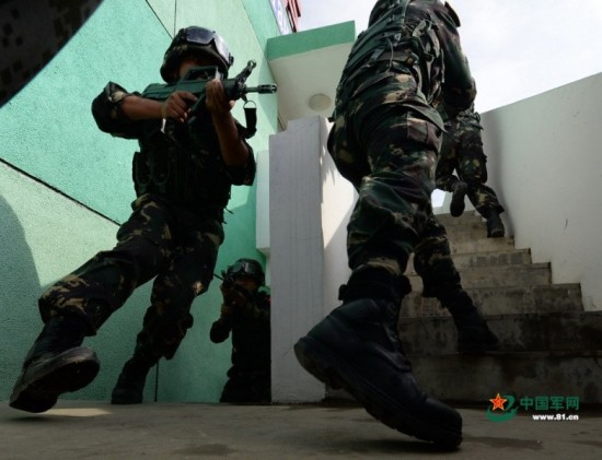 在城市反恐演习中,中方特战队员快速出击控制楼内的恐怖分子。