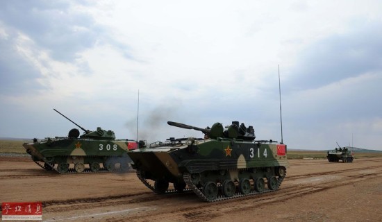 在内蒙古朱日和训练基地,参加“和平使命—2014”联合反恐军事演习的中方官兵驾驶履带式步战车在战役协同训练中(8月27日摄)。8月28日,“和平使命—2014”联演战役筹划阶段结束,实兵实弹的战役实施演练于29日打响。据介绍,在战役实施演练中,联合侦察监视、联合精确打击、联合空降机降和联合营救人质等将成为协同的重点。新华社记者 张领 摄