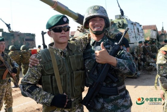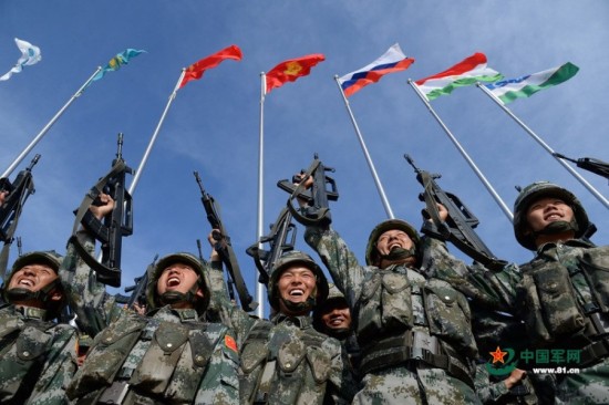 8月29日,演习结束后,中方参演部队官兵在上合组织成员国的旗帜下,欢庆演习圆满成功。