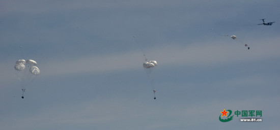 8月29日,中方参演空降部队采取“人装同机,重装联投”方式实施空降。