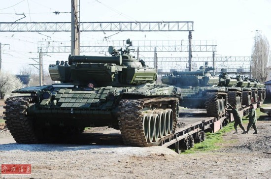 3月31日,在克里米亚城市辛菲罗波尔附近的火车站,俄罗斯坦克兵等待T-72坦克从火车上卸下。