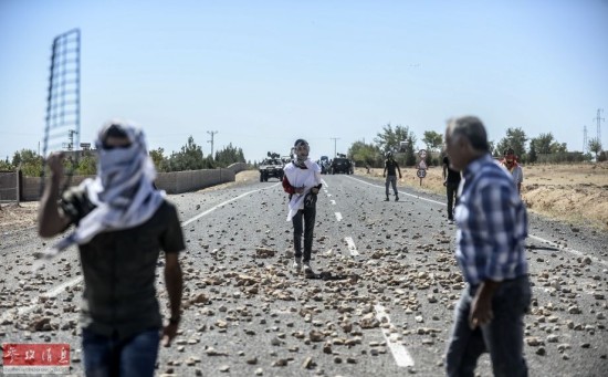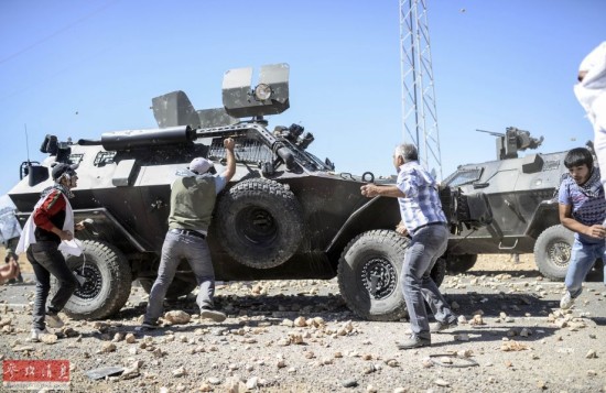 当地时间2014年9月21日,土耳其桑尼乌法,土耳其政府暂时关闭了西南边境后,库尔德人与土耳其士兵发生冲突。媒体认为,当前情况下,西方国家难以和叙利亚库尔德武装展开合作。最主要原因是,这一武装和土耳其库尔德工人党存在联系,而后者被美国和欧盟视为恐怖组织。