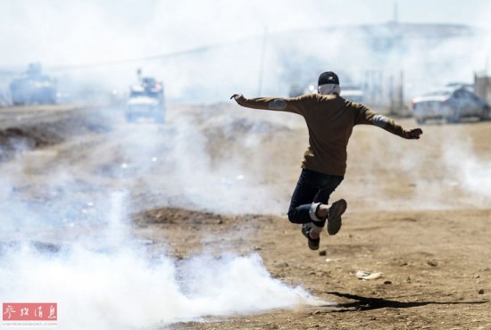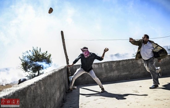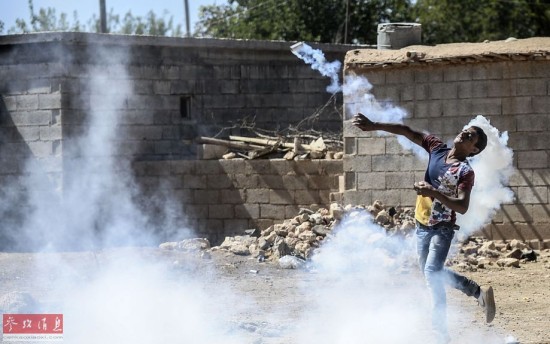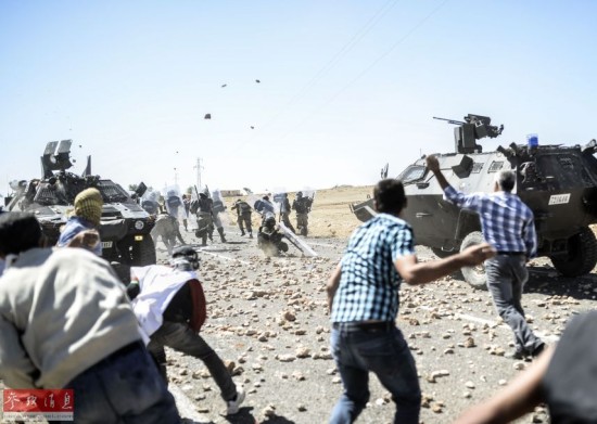 当地时间2014年9月21日,土耳其桑尼乌法,土耳其政府暂时关闭了西南边境后,库尔德人与土耳其士兵发生冲突。