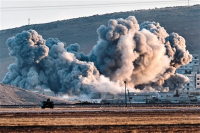 10月8日,叙利亚北部边境地区,美军战机对“伊斯兰国”武装发动空袭后,腾起巨大烟雾。