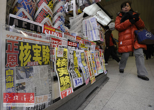 资料图片:世界各国对朝鲜核试验严重关切。2013年2月12日,在日本东京,一间报亭内许多报纸的头条都是关于朝鲜核试验的新闻。据朝鲜中央通讯社12日报道,朝鲜当天成功进行了第三次地下核试验。日本首相安倍晋三同日宣布,日本将采取包括单独制裁在内的各种手段应对朝鲜核试验。新华社发(关贤一郎摄)