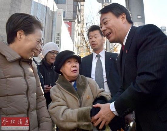 日本众议院选举投票前夕,主要反对党民主党的党首海江田万里(右)13日在东京街头参加竞选活动。(法新社)