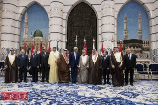 资料图片:美国国务卿克里(中)与海合会国家以及地区国家的外长在沙特吉达合影。克里在吉达会议上说服阿拉伯国家联合对抗“伊斯兰国”。(法新社)