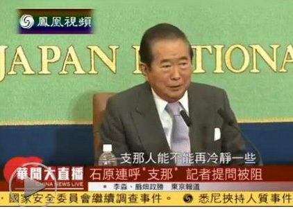 石原回答凤凰卫视记者提问时,不停说“支那”,当鳯凰台记者举手想追问,被日本记者俱乐部主持人阻止,不再给记者发言机会;石原于是又补充一句,“支那人应该冷静,能不能再冷静一些”。(中国台湾网 何建峰)