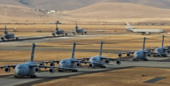 C-17运输机群与KC-10加油机群列队准备起飞。