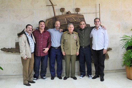 劳尔·卡斯特罗(右三)17日在哈瓦那与被美国释放的“古巴五人”情报人员合影,其中3人于当日被释放。(路透社)