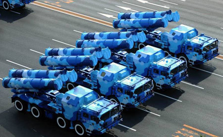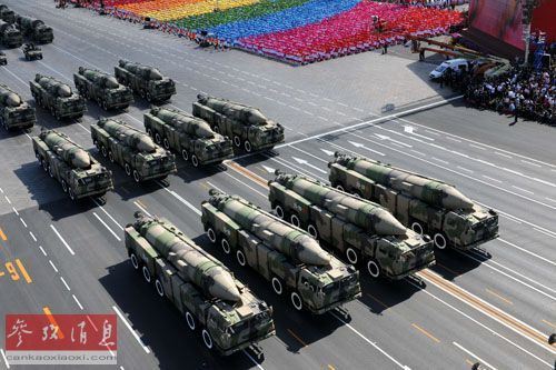 资料图:2009年10月1日,首都各界庆祝中华人民共和国成立60周年大会在北京举行。这是某新型中远程地地常规导弹方队接受检阅。新华社记者 谢环驰摄