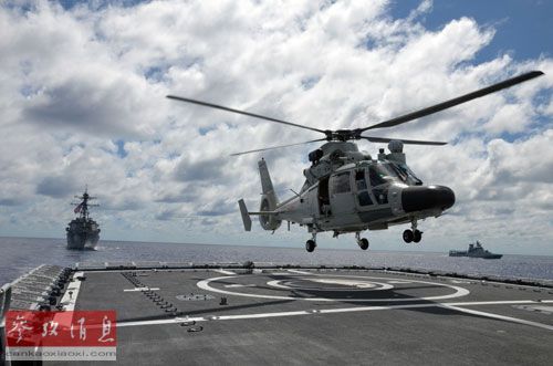 资料图:6月18日,中国海军舰载直升机从“海口”舰起飞实施航拍。当地时间6月18日下午13时至16时,向美国夏威夷航渡的多国特混编队按计划进行编队队形训练并实施航拍。美国导弹驱逐舰“霍华德”号和中国“海口”舰分别派出直升机对特混编队进行了航拍。新华社记者郑文浩摄