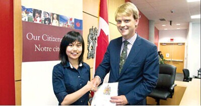 加拿大移民部长亚历山大(右)早前出席公民入仪议式,颁发公民证书给华裔。(加拿大《明报》)
