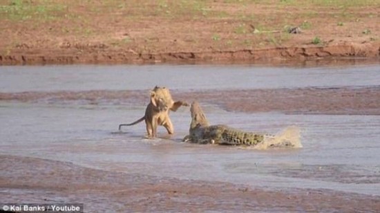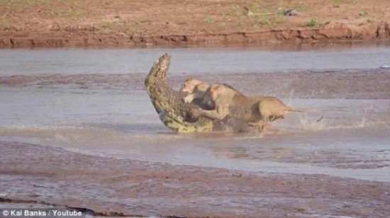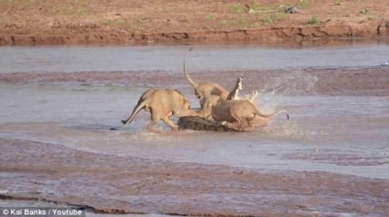 据《每日邮报》2014年8月20日报道,肯尼亚Samburu野生动物保护区的数头狮子最近因争夺食物,与一头成年尼罗河鳄鱼打了起来。最终,狮子们凭借数量上的优势,咬伤了这头巨大的鳄鱼,后者随即逃之夭夭。(网页截图)