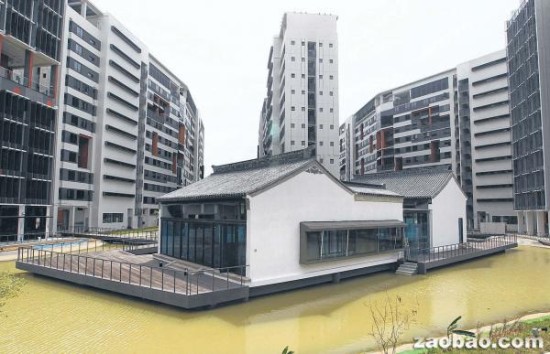 新科大校园内的两栋浙江古厝坐落在宿舍附近,由生态池塘环绕的两栋建筑完工后将用来举办活动。(图片来源于网络)