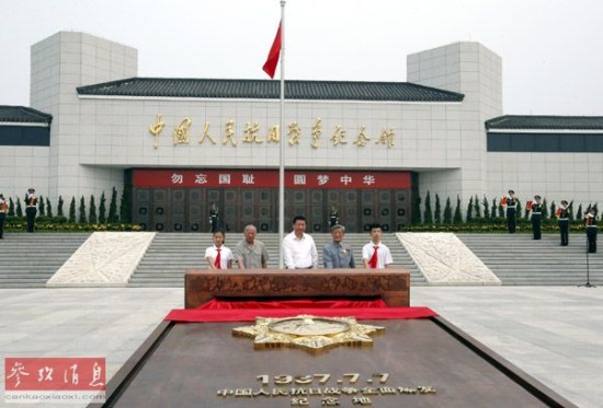 资料图片:北京,2014年7月7日首都各界在中国人民抗日战争纪念馆隆重集会,纪念全民族抗战爆发77周年。中共中央总书记、国家主席、中央军委主席习近平出席纪念仪式并发表重要讲话。这是习近平和抗战老战士以及少年儿童一起按下启动按钮,为“独立自由勋章”雕塑揭幕。新华社记者 鞠鹏 摄