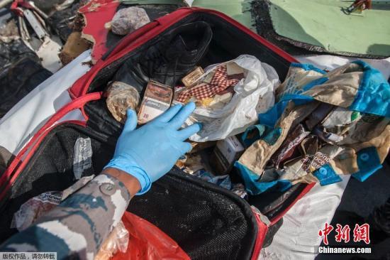 当地时间2015年1月5日,印尼泗水,印尼海军展示从爪哇海中打捞到的亚航失事客机残骸与遇难者的遗物。