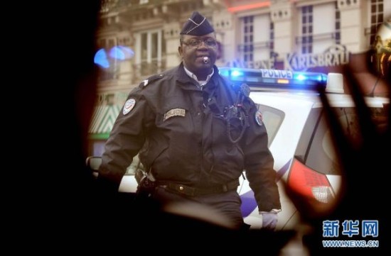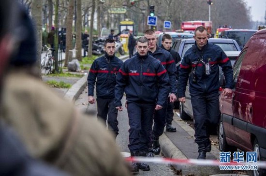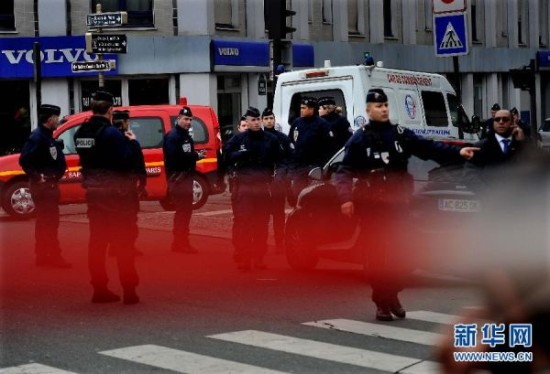 1月7日,在法国巴黎,警察在袭击现场附近警戒。位于法国巴黎的《沙尔利周刊》总部7日遭到武装分子袭击,目前已造成12人死亡,另有多人受伤。法国总统奥朗德强烈谴责此次袭击。他在袭击现场说:“这无疑是一起恐怖袭击。”新华社记者陈晓伟摄