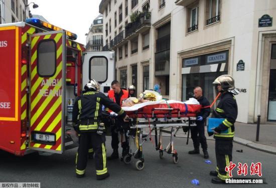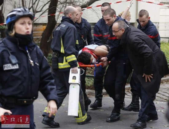 7日,急救人员正在从《沙尔利周刊》巴黎办公室向外运送伤员。(路透社)