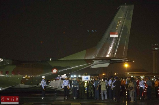 1月2日,印度尼西亚泗水市,承载亚航遇难者遗体的运输机抵达泗水市。